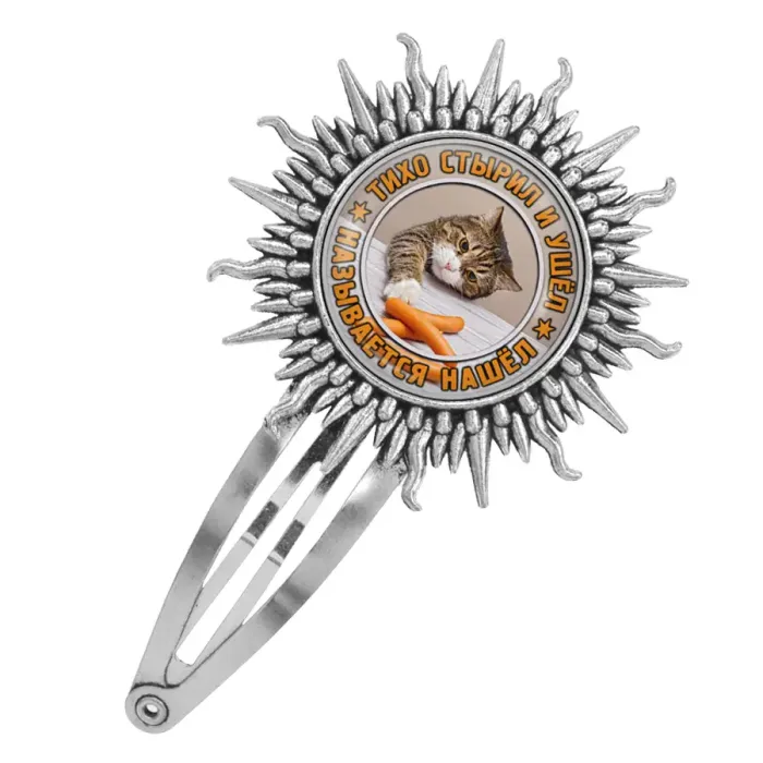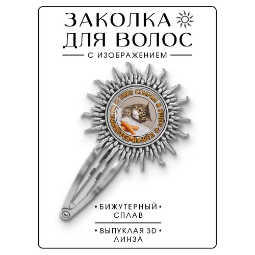 Размеры и комплектация: Размер заколки 77х45 мм, диаметр изображения 25 мм. Упаковка: прозрачный пакет.