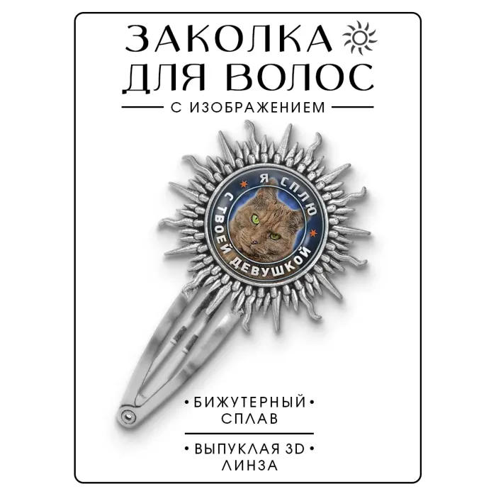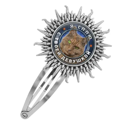 Размеры и комплектация: Размер заколки 77х45 мм, диаметр изображения 25 мм. Упаковка: прозрачный пакет.