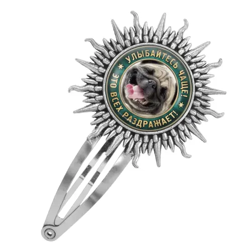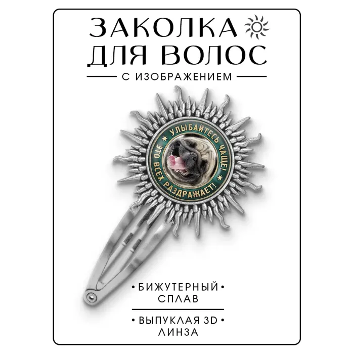 Размеры и комплектация: Размер заколки 77х45 мм, диаметр изображения 25 мм. Упаковка: прозрачный пакет.
