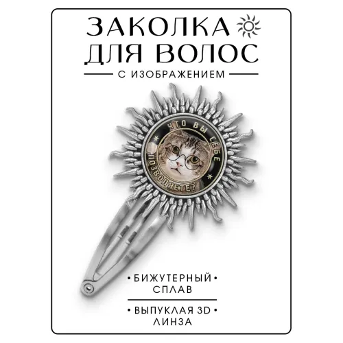 Заколка для волос с декоративным элементом. Материал — бижутерный сплав. Ключевая особенность — изображение под выпуклой стеклянной линзой.