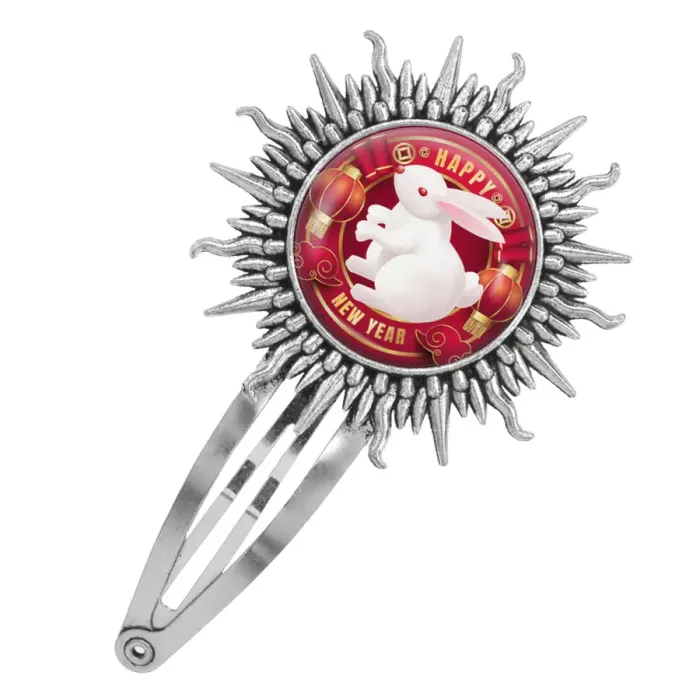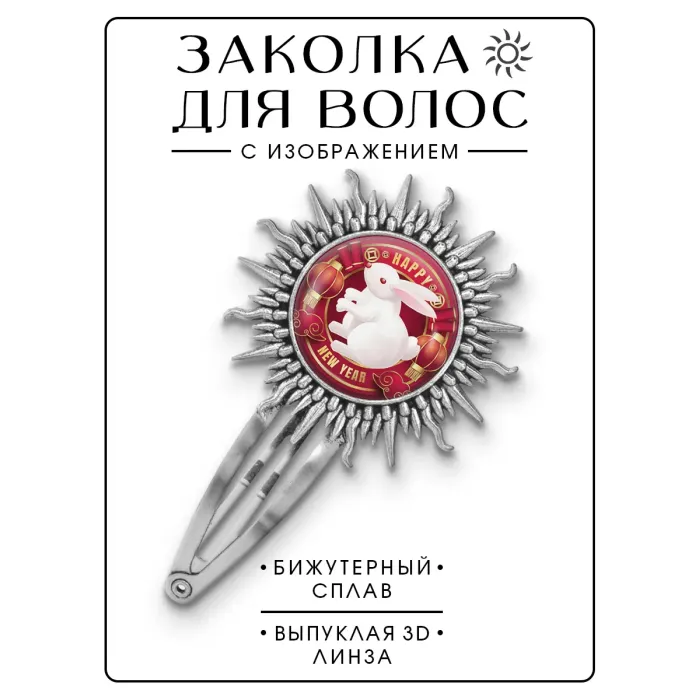 Заколка для волос с новогодней тематикой. Изготовлена из бижутерного сплава с серебристым покрытием, украшена изображением кролика под стеклянной линзой.