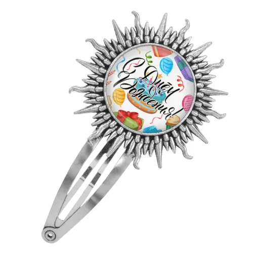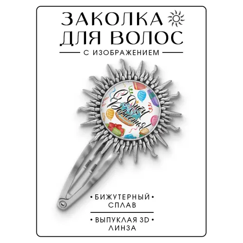 Заколка для волос с поздравительной надписью «С Днём рождения!». Изготовлена из бижутерного сплава с покрытием под серебро, декоративный элемент защищён выпуклой стеклянной линзой.