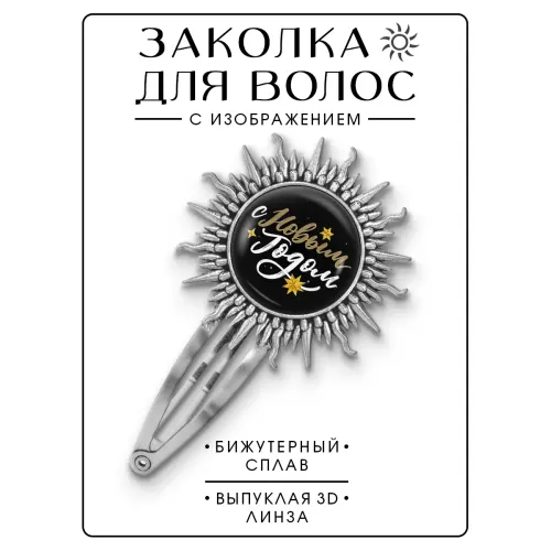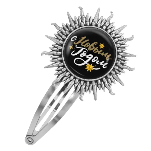 Заколка для волос с новогодней тематикой. Изготовлена из бижутерного сплава с серебристым покрытием, изображение защищено выпуклой стеклянной линзой.