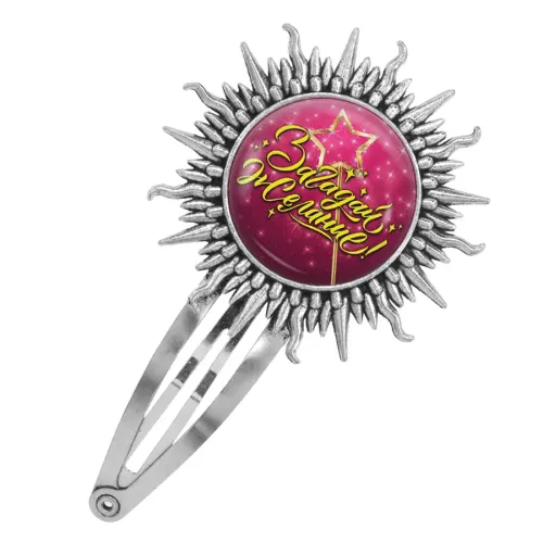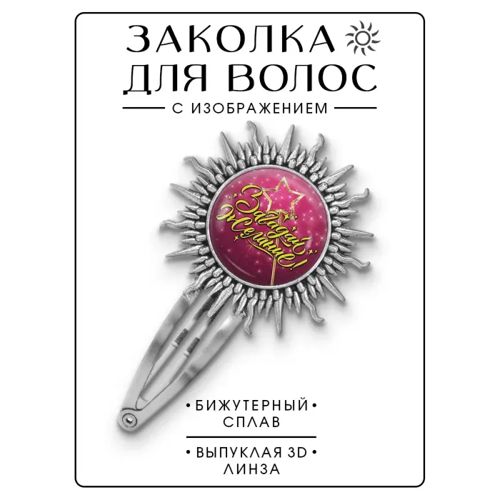 Размеры и комплектация: Размер заколки 77х45 мм. Диаметр изображения 25 мм. Упаковка — прозрачный пакет.