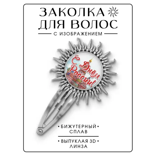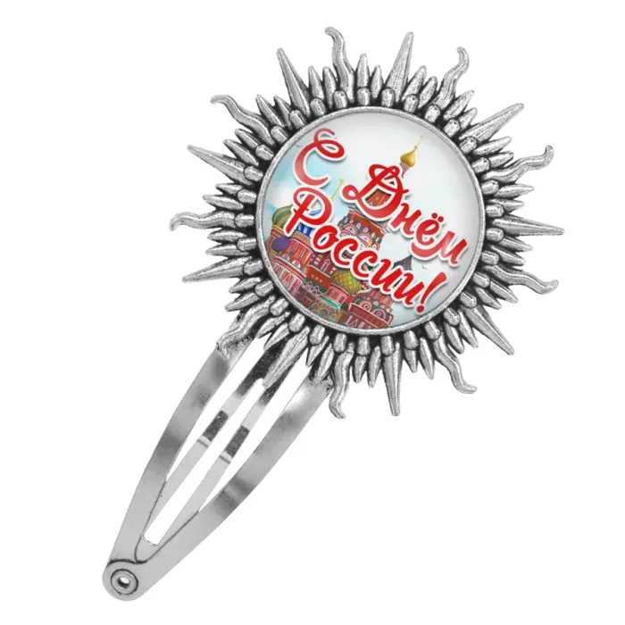 Заколка с символикой Дня России. Изготовлена из бижутерного сплава с покрытием под серебро, изображение защищено выпуклой стеклянной линзой.