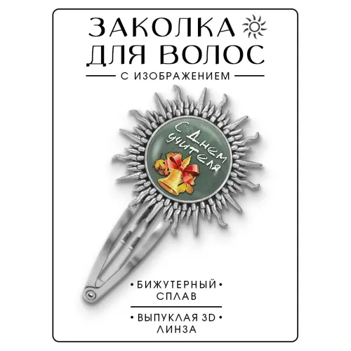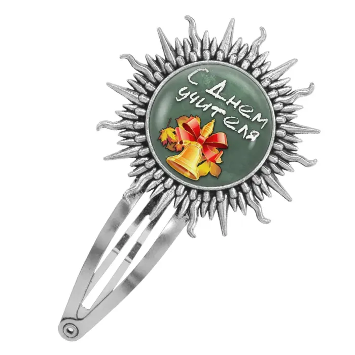 Заколка-сувенир ко Дню учителя из бижутерного сплава с изображением под выпуклой стеклянной линзой.