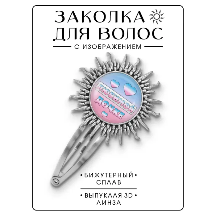 Заколка-сувенир «Любимой дочке» из бижутерного сплава с изображением под выпуклой стеклянной линзой.