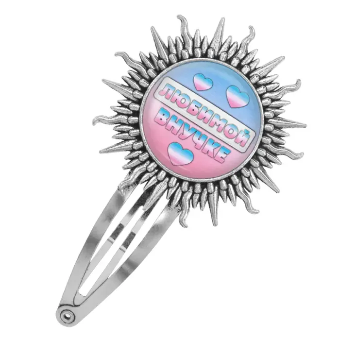 Заколка-сувенир «Любимой внучке» из бижутерного сплава с изображением под выпуклой стеклянной линзой.