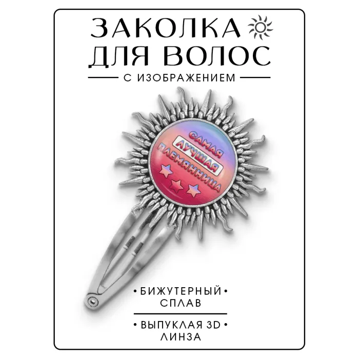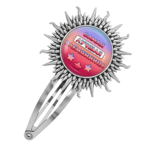 Заколка-сувенир с надписью «Самая лучшая племянница». Изготовлена из бижутерного сплава с покрытием под серебро, дизайн защищён выпуклой стеклянной линзой.