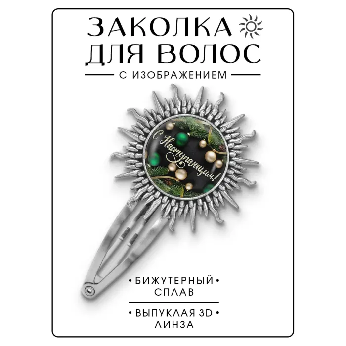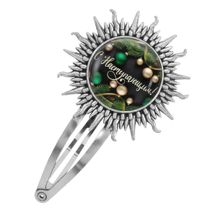Заколка «С Наступающим!» — сувенирный аксессуар из бижутерного сплава с покрытием под серебро и изображением под выпуклой стеклянной линзой.
