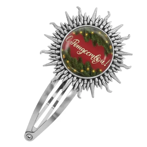 Заколка для волос с рождественским мотивом. Изготовлена из бижутерного сплава с покрытием под серебро, изображение защищено выпуклой стеклянной линзой.