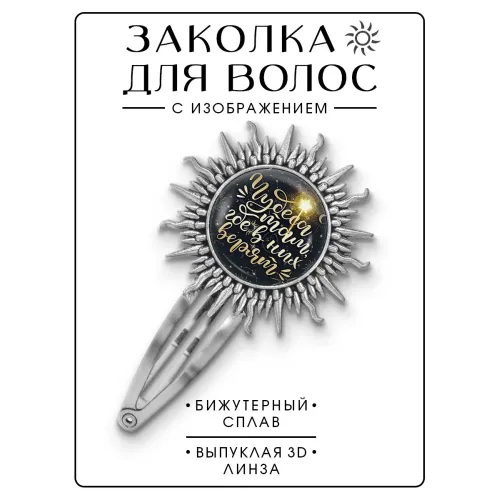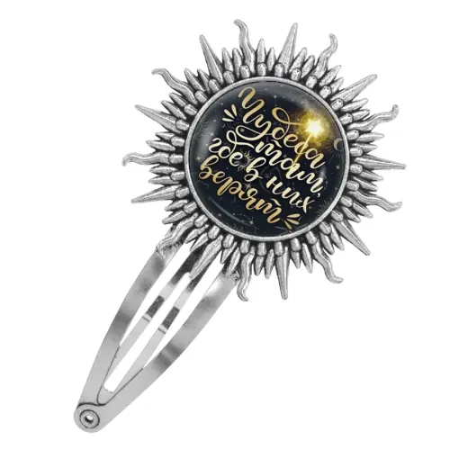 Заколка для волос из бижутерного сплава с круглым декоративным элементом под стеклянной линзой.