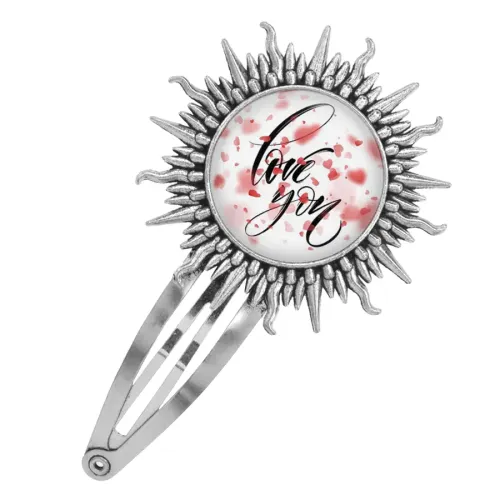 Заколка для волос с надписью «Я тебя люблю». Изготовлена из бижутерного сплава с покрытием под серебро, изображение защищено выпуклой стеклянной линзой.