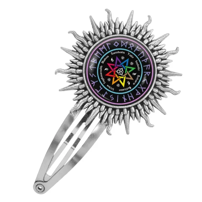 Заколка с символическим изображением Викканского колеса года. Изготовлена из бижутерного сплава с покрытием под серебро, изображение защищено выпуклой стеклянной линзой.