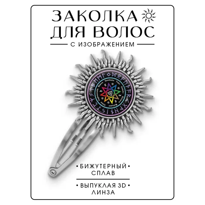 Размеры и комплектация: Размер заколки 77х45 мм, диаметр изображения 25 мм. Упаковка: прозрачный пакет.