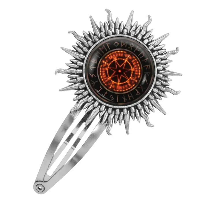 Заколка для волос из бижутерного сплава с декоративным элементом в виде звезды под стеклянной линзой.