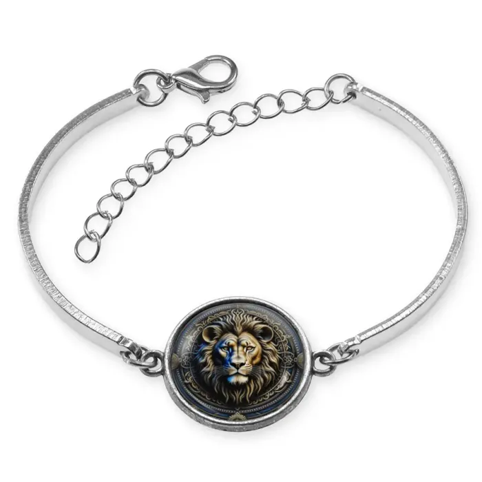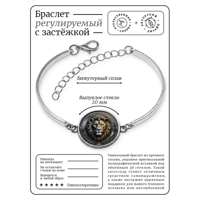 Металлический браслет-сувенир с декоративным медальоном. Изображение льва под выпуклой стеклянной линзой, регулируемая застёжка.