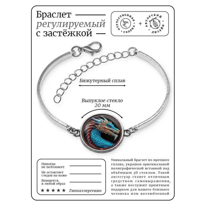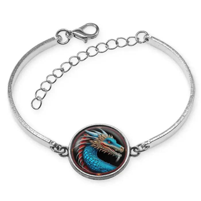 Металлический браслет с декоративным элементом в виде дракона. Изображение защищено выпуклой стеклянной линзой.