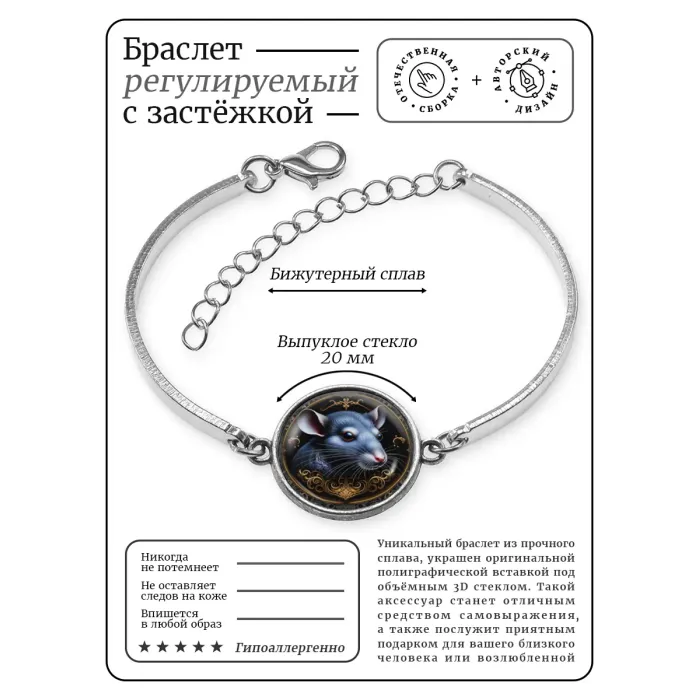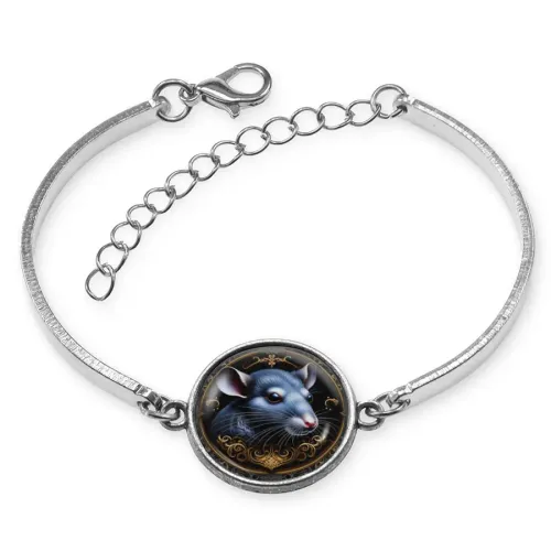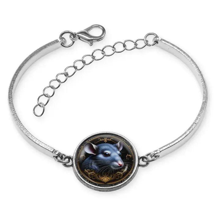 Металлический браслет с изображением крысы. Изготовлен из бижутерного сплава, имеет регулируемую застёжку.