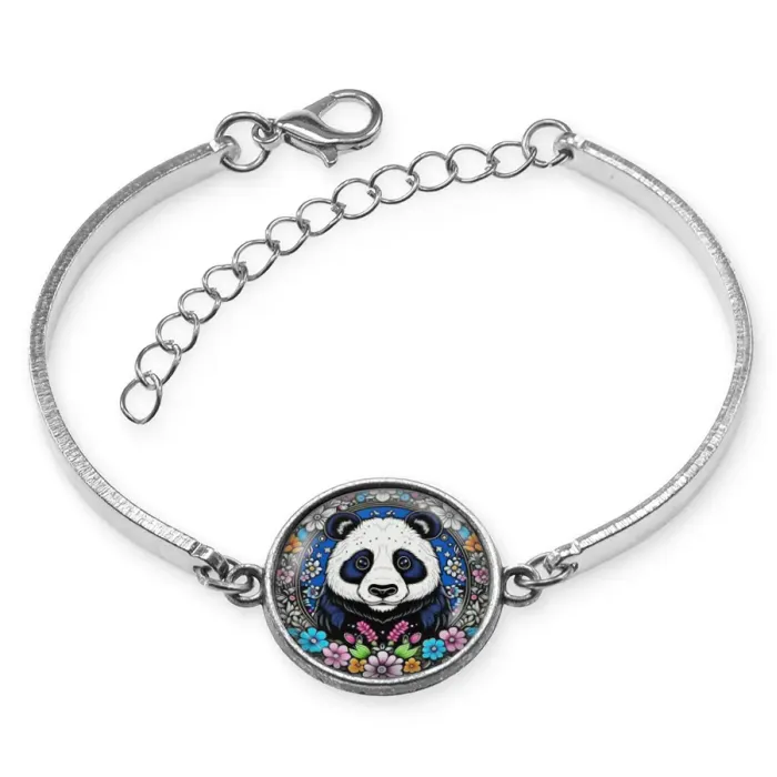 Металлический браслет с декоративным элементом в виде панды с цветами.
