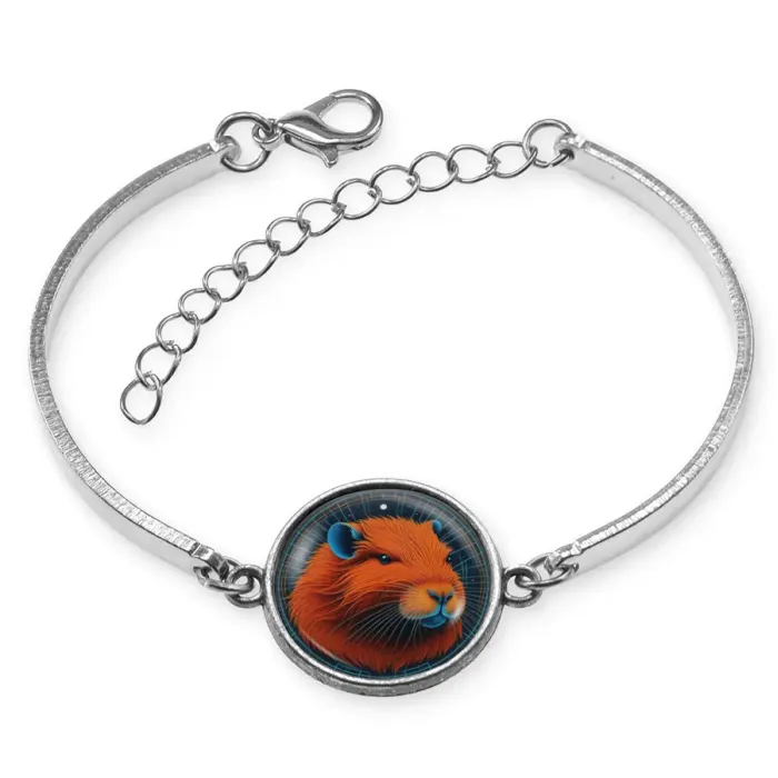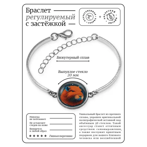 Металлический браслет с декоративным элементом в виде грызуна под стеклянной линзой.