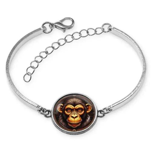Металлический браслет с декоративным элементом в виде шимпанзе. Изображение защищено выпуклой стеклянной линзой.