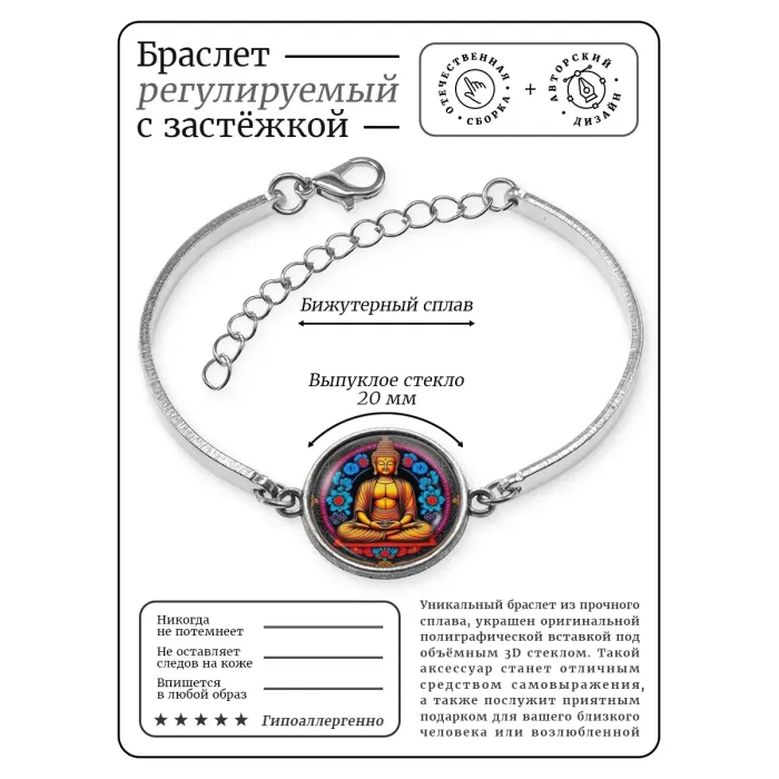 Металлический браслет с изображением Будды под стеклянной линзой.
