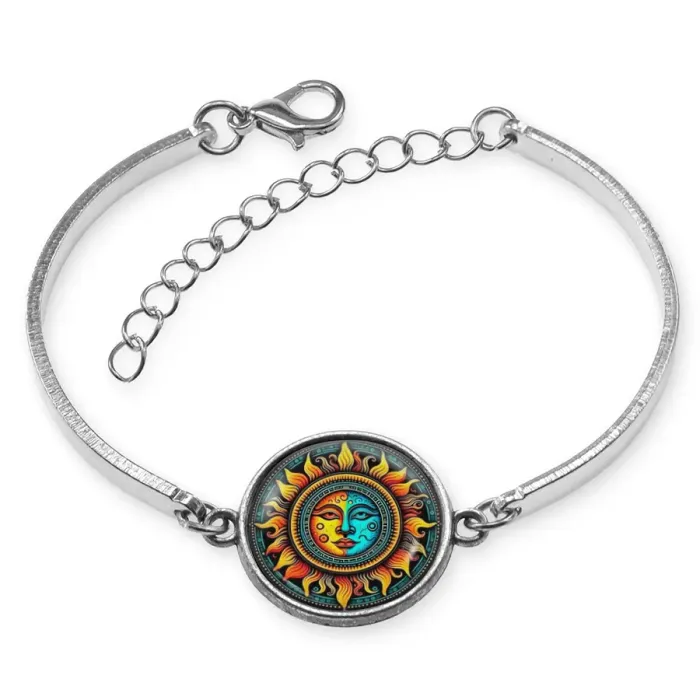 Браслет из бижутерного сплава с декоративным элементом «Двуликое солнце» под стеклянной линзой и регулируемой застёжкой.