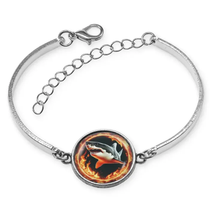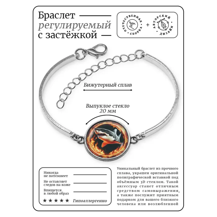 Металлический браслет с декоративным элементом в виде акулы. Изготовлен из бижутерного сплава, имеет регулируемую застёжку.