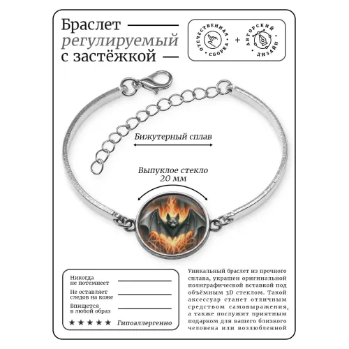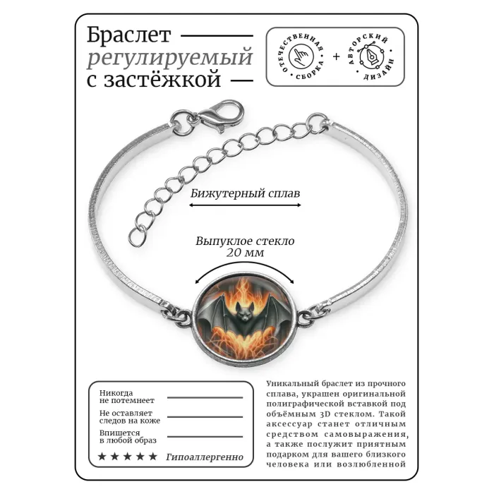 Браслет из бижутерного сплава с декоративным элементом в виде летучей мыши под стеклянной линзой.