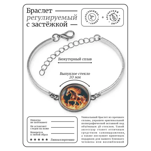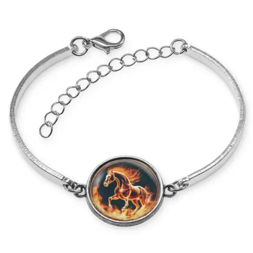 Браслет из бижутерного сплава с декоративным элементом «Огненная лошадь» под выпуклой стеклянной линзой.