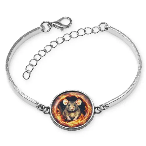 Металлический браслет с декоративным элементом в виде мыши под стеклянной линзой.