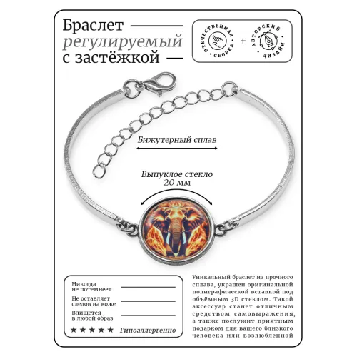 Металлический браслет с изображением слона под выпуклой стеклянной линзой.