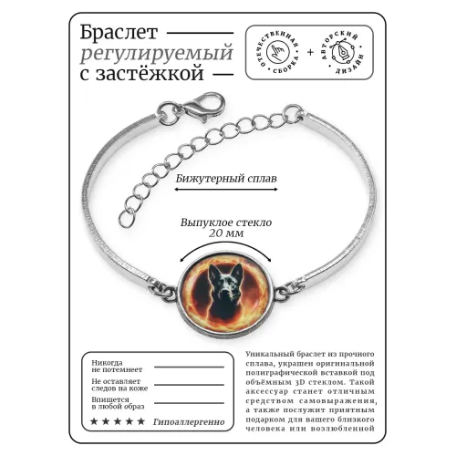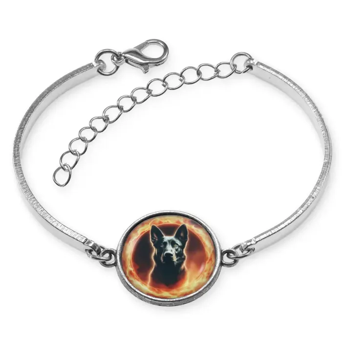 Металлический браслет с изображением собаки под стеклянной линзой.