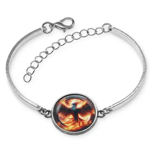 Металлический браслет с изображением феникса под стеклянной линзой.