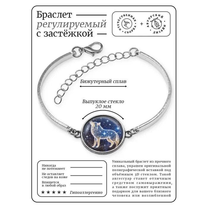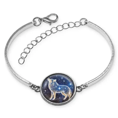 Металлический браслет с изображением волка под стеклянной линзой.