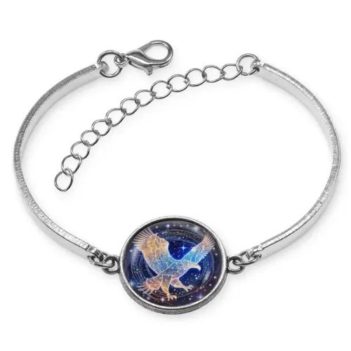 Металлический браслет с декоративным элементом в виде орла под стеклянной линзой.