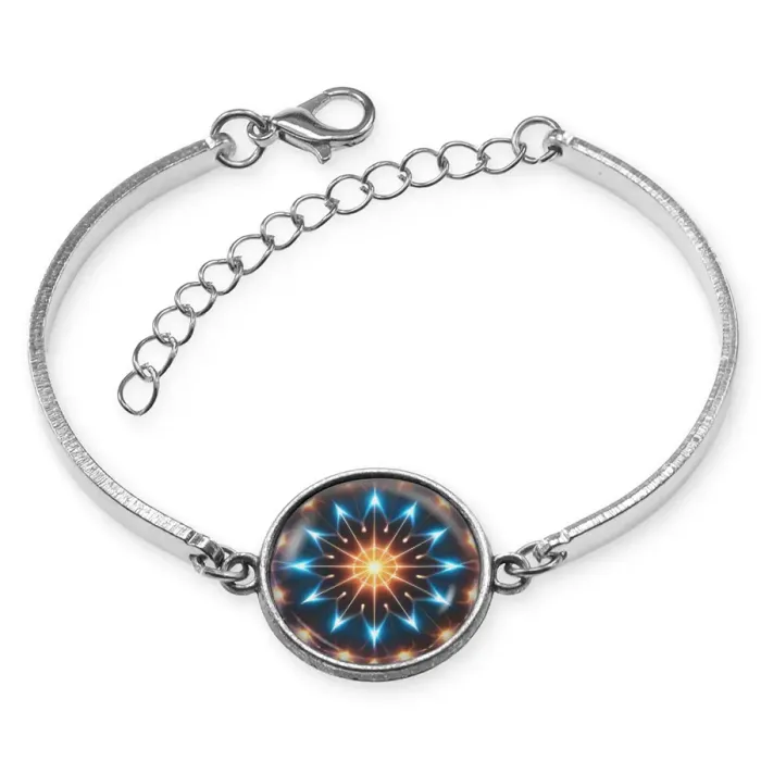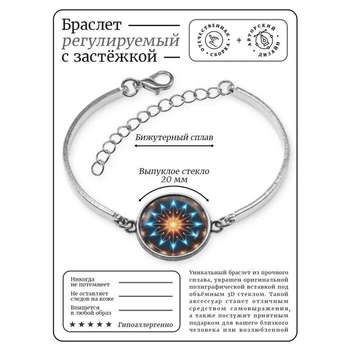 Браслет из бижутерного сплава с регулируемой застёжкой. Изображение диаметром 18 мм защищено выпуклой стеклянной линзой.