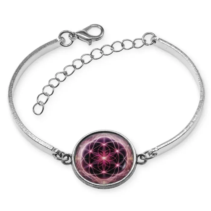 Металлический браслет с декоративным элементом под стеклянной линзой.