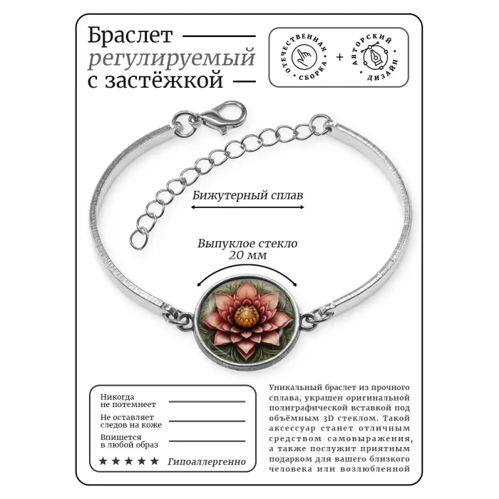 Металлический браслет с изображением лотоса под выпуклой стеклянной линзой.