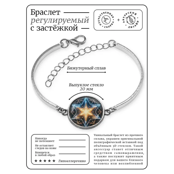 Металлический браслет с изображением шестиконечной звезды. Изделие имеет регулируемую застёжку.
