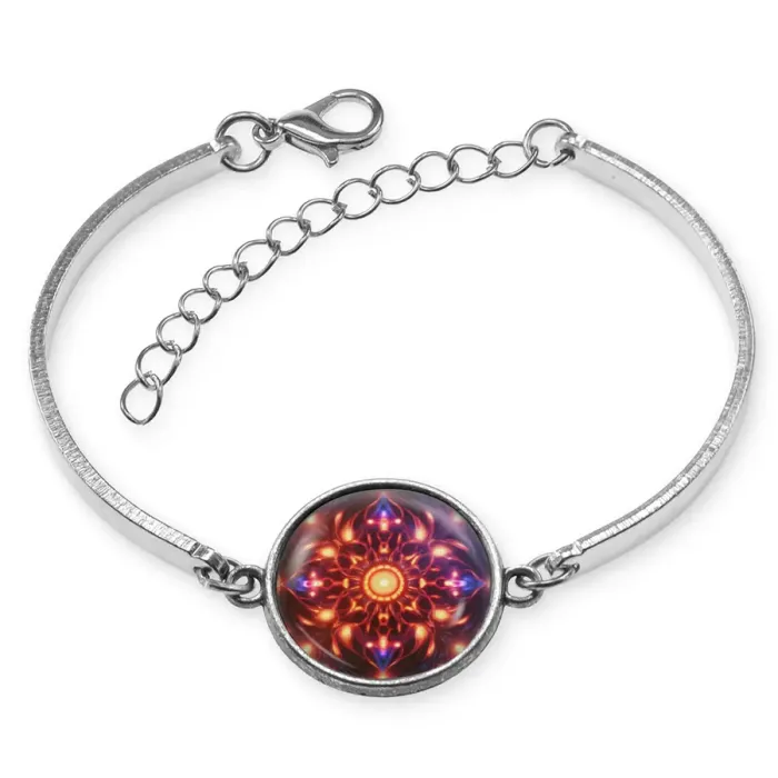 Браслет из бижутерного сплава с геометрическим принтом под стеклянной линзой.