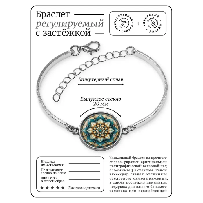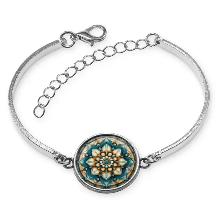 Браслет из бижутерного сплава с декоративным элементом в виде цветка жизни. Изображение защищено выпуклой стеклянной линзой.