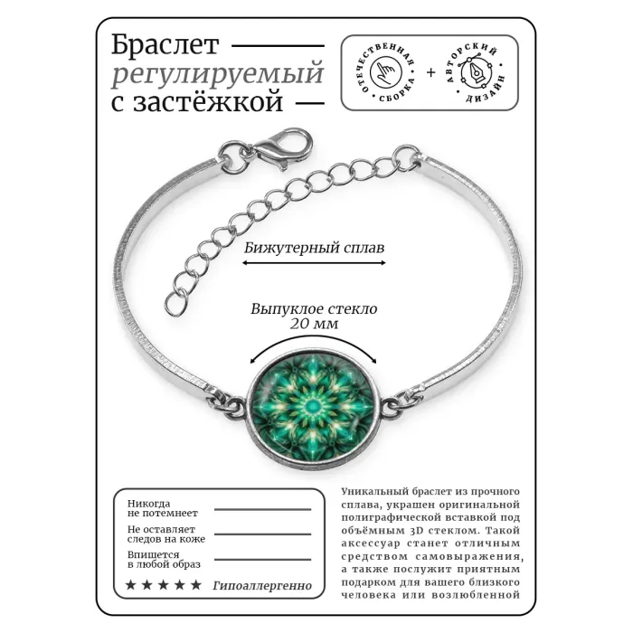 Элегантный браслет из бижутерного сплава, который станет ярким акцентом в любом образе. Этот аксессуар с регулируемой по длине застёжкой удобно носить и легко подстраивать под индивидуальные предпочтения. Изображение диаметром 18 мм прикрыто выпуклой стеклянной линзой, что придаёт изделию особую выразительность и глубину. Браслет упакован в прозрачный пакет, что делает его отличным вариантом для подарка или личного использования.