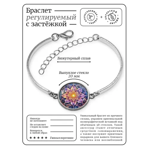 Браслет металлический Лотос — символ жизни и гармонии, который станет стильным дополнением любого образа. Изготовленный из бижутерного сплава, он отличается прочностью и долговечностью. Регулируемая застёжка позволяет удобно подгонять длину изделия под индивидуальные предпочтения. Изображение диаметром 18 мм защищено выпуклой стеклянной линзой, что придаёт ему особую выразительность. Упаковка в прозрачный пакет делает этот браслет отличным вариантом для подарка или личного использования.
