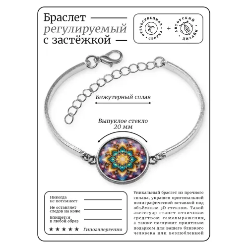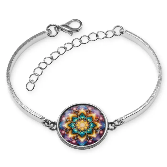 Металлический браслет с декоративным элементом «Цветок жизни» под стеклянной линзой.