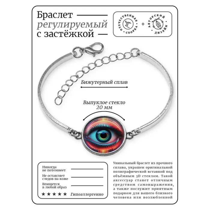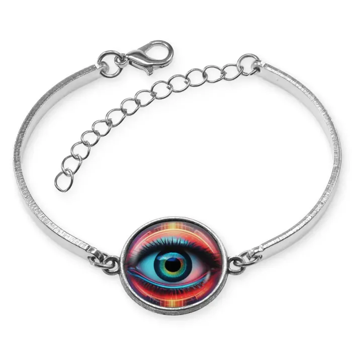 Металлический браслет-сувенир с декоративным элементом «Око» под стеклянной линзой.