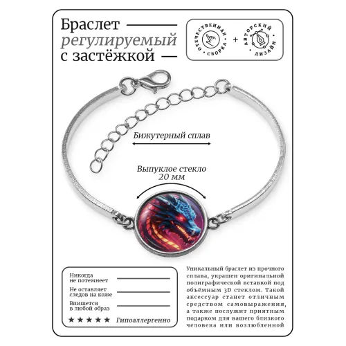 Браслет из бижутерного сплава, украшенный изображением дракона, символизирующим силу и мудрость. Регулируемая застёжка позволяет адаптировать изделие под любой размер запястья, обеспечивая комфорт при носке. Изображение диаметром 18 мм защищено выпуклой стеклянной линзой, что придаёт ему яркость и выразительность. Товар упакован в прозрачный пакет, что делает его отличным вариантом для подарка или личного использования.
