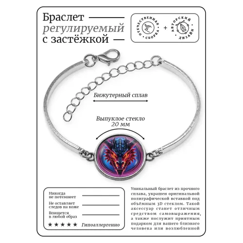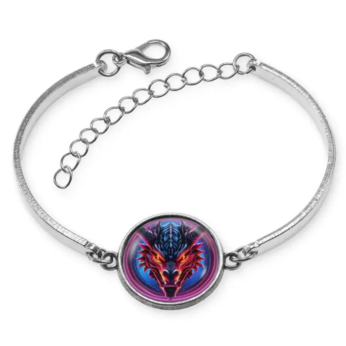 Браслет из бижутерного сплава с декоративным элементом в виде рогатого дракона под стеклянной линзой.