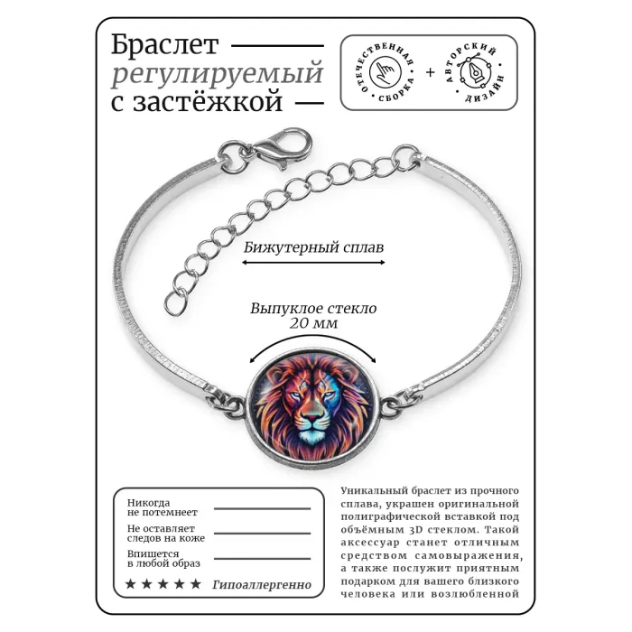Металлический браслет с декоративным элементом в виде льва. Изготовлен из бижутерного сплава, имеет регулируемую застёжку.